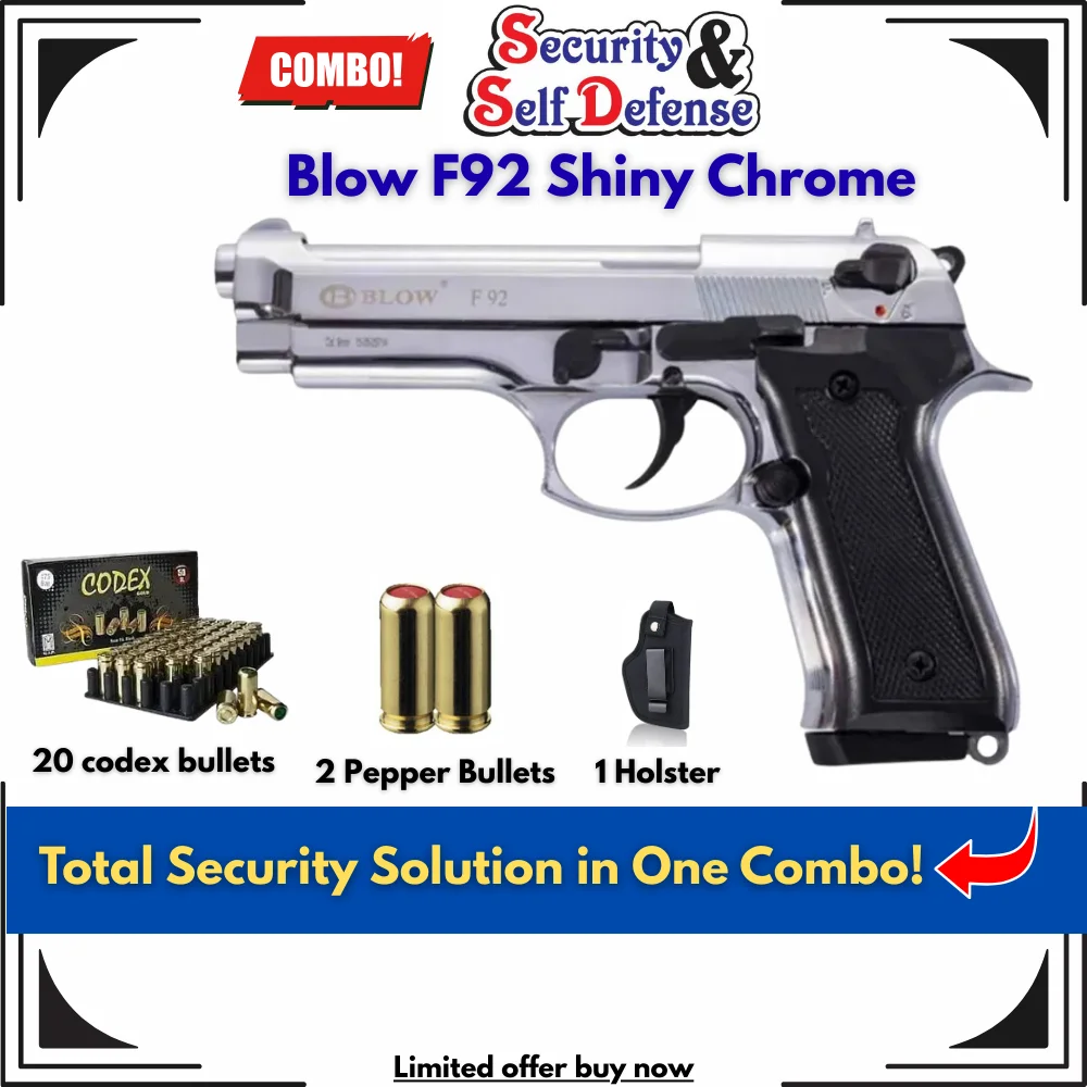 Blow F92 Shiny Chrome with 20 Codex Bullets, 2 Pepper Bullets & 1 Holster