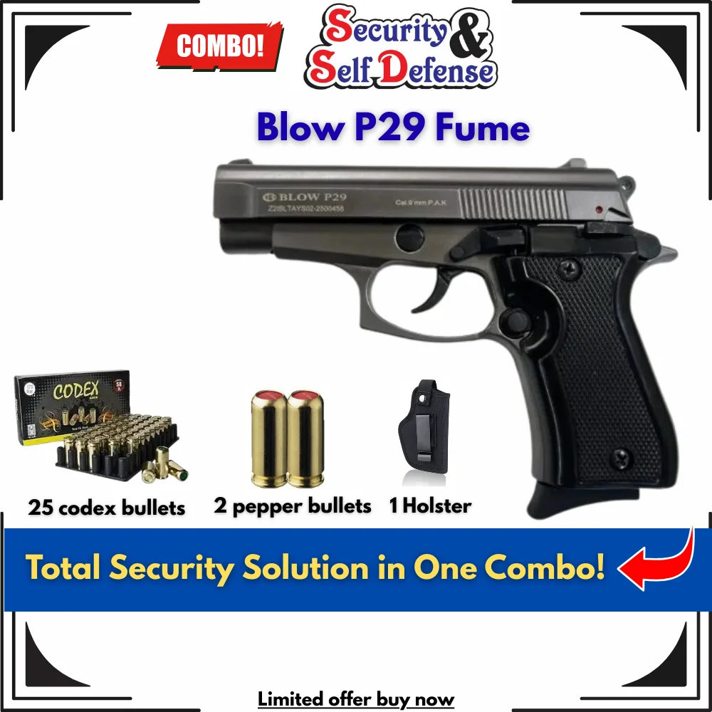 In summary, the Blow P29 Fume with 25 Bullets, 2 Pepper Bullets & 1 Holster is a well-rounded blank pistol designed for legal, non-lethal self-defense. Its 14+1 magazine capacity, multi-ammunition compatibility, proven track record, and complete accessory package make it a strong option for personal protection. For anyone exploring blank guns for sale as a reliable and responsible security solution, this model delivers value, performance, and peace of mind.